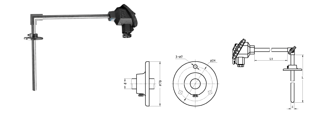 直角彎頭熱電偶適用于生產現場存在高溫和有害氣體對熱電偶接線盒有影響,或不宜直接水平及垂直安裝場合,具體參見安徽天康溫度傳感器選型樣本。